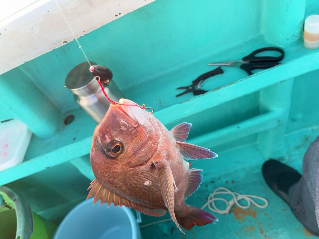 そんなこんなで6時53分にはツ抜け達成。この後、潮が緩んでアタリが遠退くのですが、初登板の「kaijin テンヤマダイ 240L」に色々結んで使用感を確認しました。