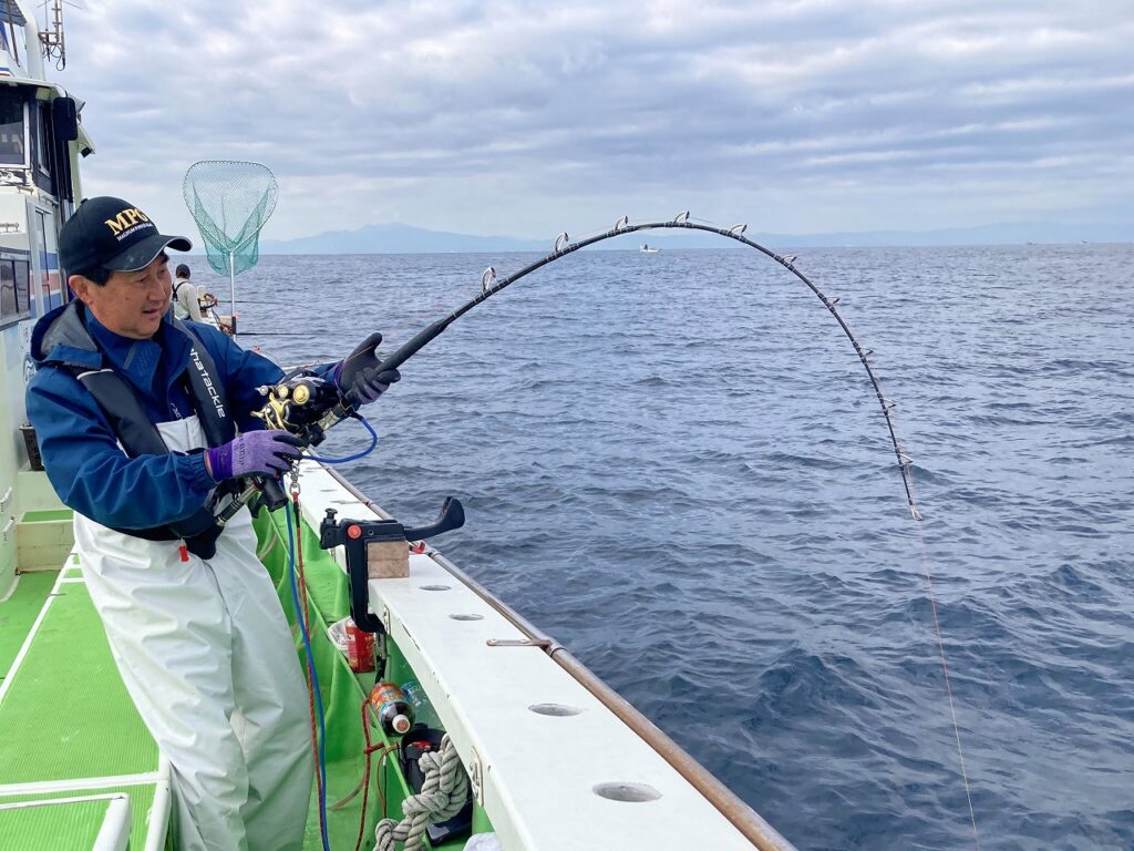 ロッドにかかるテンションが常に一定になるようブランクスの曲がり込みが戻った分ラインを巻き取っていくと、徐々に魚の引きも弱まり、それまで巻き取りができなかった電動リールも巻き上げができるようになってきました。