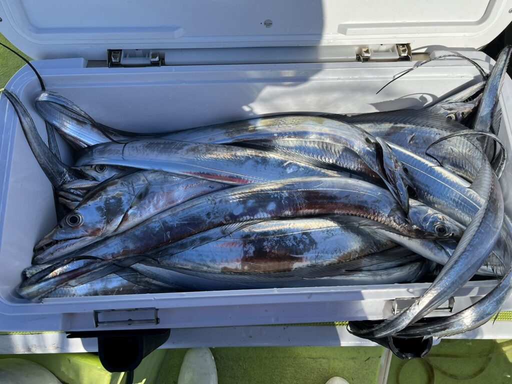 それからは群れを追いかけながらの拾い釣りで、1流しに1~2本追加していく感じでした。落とせば釣れるという状況では無く、またパターンも定まらず、サイズもやや小型のタチウオが多いようでした。やや食いが渋くテクニックが少し必要となるので面白くもありますが、少々難易度の高い釣りでした。浅場でウネリの影響もあってか、タチウオは捕食が下手な魚ですので、アタリが出てもなかなか本アタリにも結びつかず、掛かりがかなり浅く、バラシや掛け損ないが多々ありました。