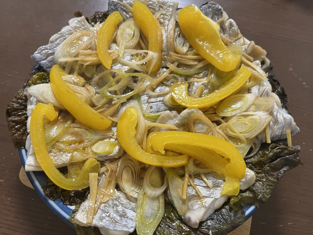 タチウオが太ってきて、テンヤを外す際はなかなかの太さで掴み難いので歯には触らないようにご注意ください。切れて出血すると1時間以上血が止まらない事もあります。脂も乗って食べるのには最高な時期となりましたので、1本だけ自分用に持ち帰って半分を塩焼き用、残り半分を炙り刺しと紹興酒蒸しにしてみました。