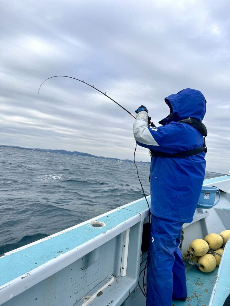 本日は凪。船はあまり動いていない様子。船に動きがあれば、真下に落としてもチャンスはあるかもしれないのですが、本日は潮の動きが鈍めなので遠投して探る事とします。