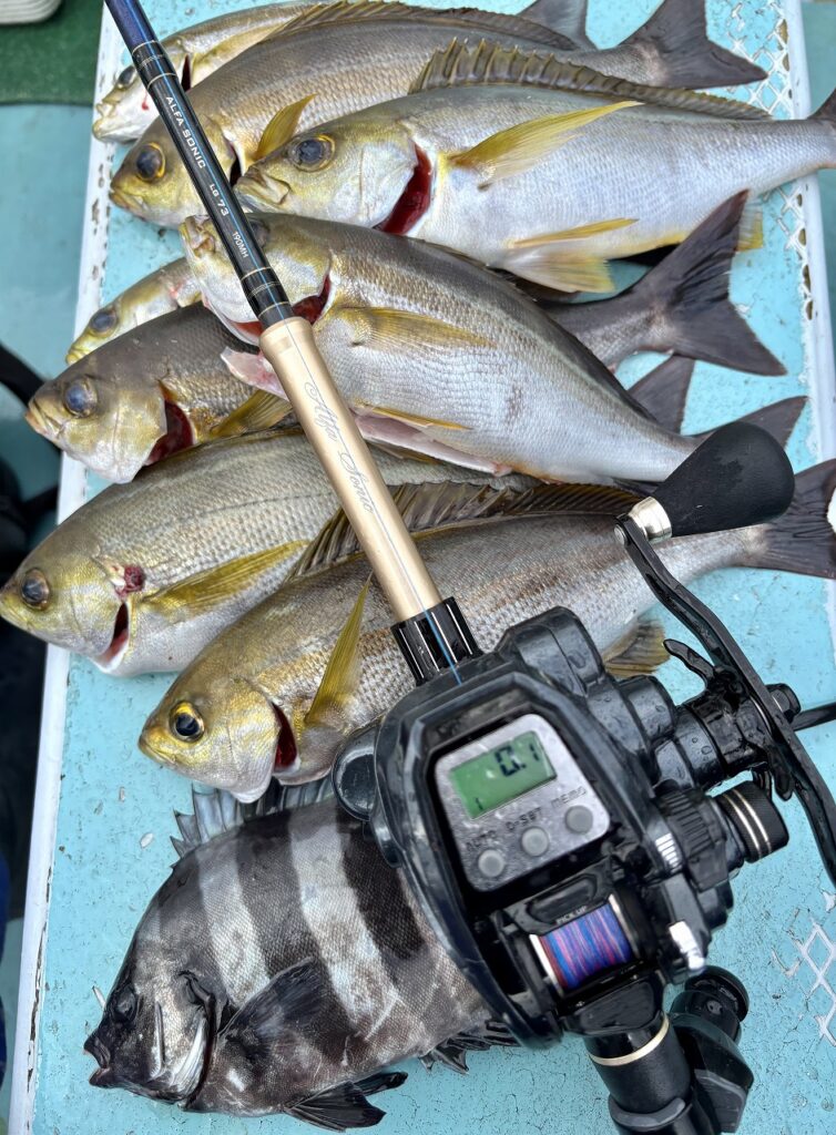 ポイントは根回りでしたが、船長が大物を求め沈船や漁礁などを探してくれますが、なかなか大物チャンスは来ません。それでも小型ながら入れ食いになるタイミングもあり、テンヤが底に着く前からアタックして来る状況も多々ありました。フォール中も油断せずにラインをゼロテンションに保ちつつ素早くラインを止められるように準備は怠れません。