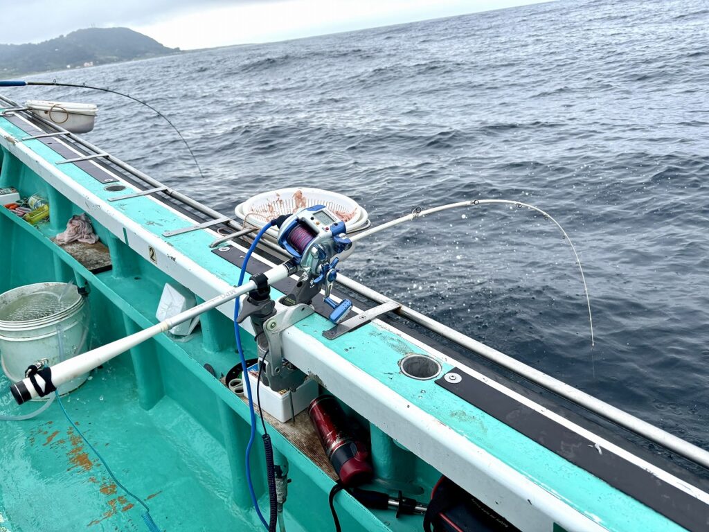 水深120m前後,ボトムから5mまで探ります。根掛かりもあるとの事なので、底立ちをとったらすぐオモリを海底から離し、1mずつ食い棚を探ります。底から2mのところでガガガッと竿をたたくようなアタリが!