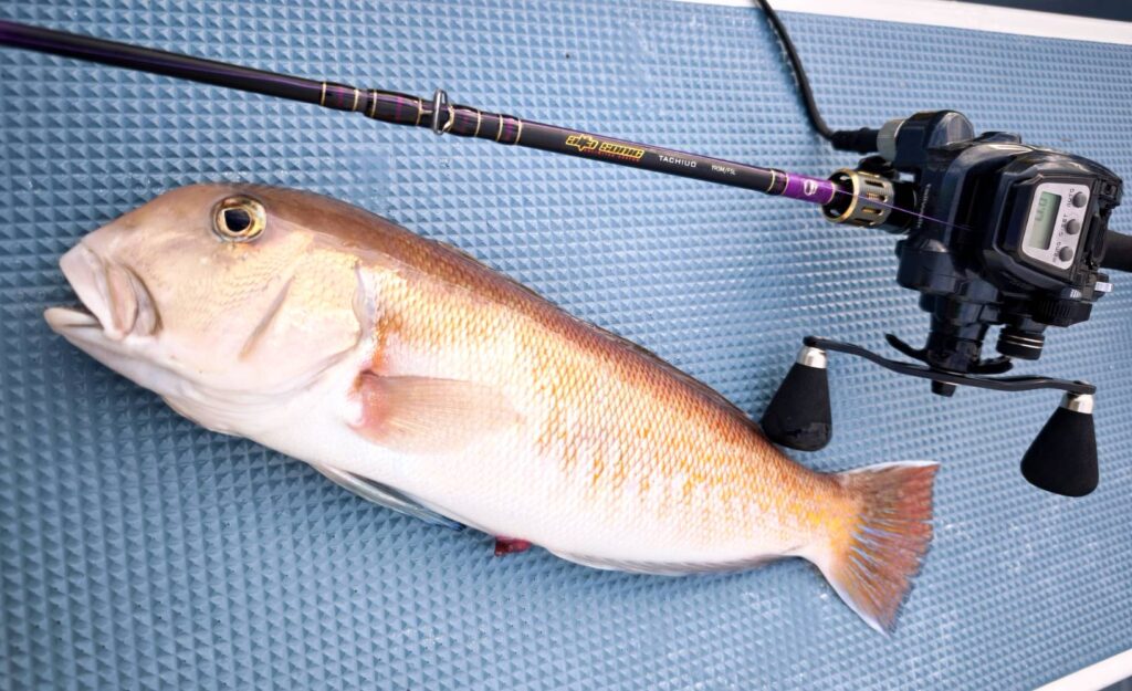 長さ・オモリ負荷、そして操作性もアマダイにドンピシャでテンション高めのノリノリ小突き(笑)からスッと底を切りふわふわ~とオキアミが落ちて行くイメージしココでアタリ出たら本命っぽいんだけどの瞬間に穂先に違和感ありでスイープに持ち上げてみたらば底に張り付くような重めの首振りに慎重な手巻きからエランDENDO100のスイッチをオンすると見事なカーブを描いて中乗りさんにも『気持ちよさそうな竿の曲がりだね♫』と褒められながらお約束の30mあたりでの暴れた引き込みを経て上がってきたのはなんと本命の白アマダイ!!それもジャスト40cmのナイスバディに朝イチからウキウキ舞い上がっちゃいましたよ〜。