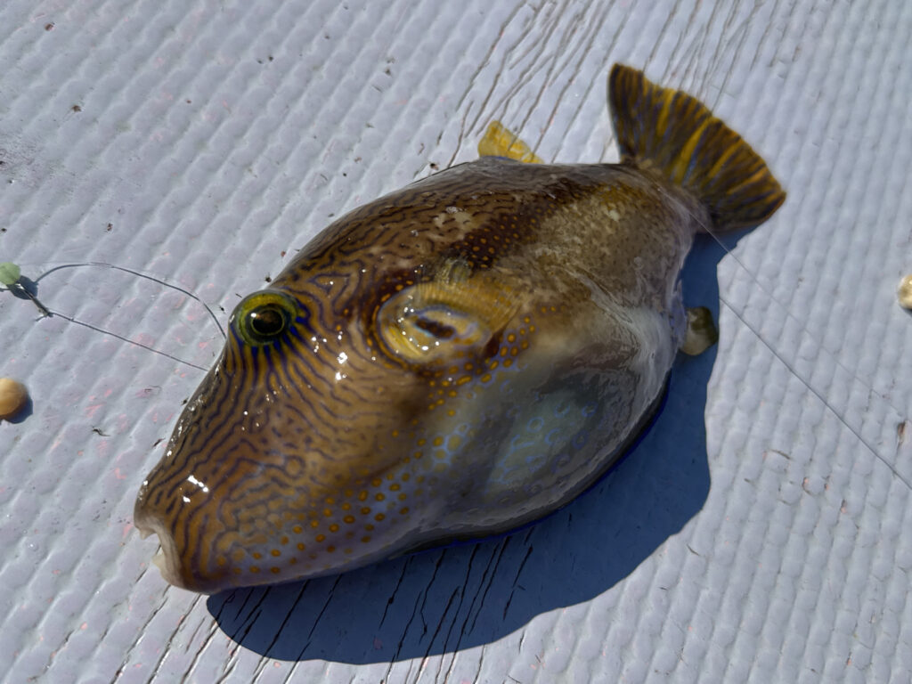 ただ、厄介な問題が・・。サバフグの猛攻です。「フグにハリ30本盗られた」との情報をキャッチして50本用意して臨んだところ、当日同船者に「前回は100本使い切った」と言われる始末。結果は釣りよりハリス交換のスキルが問われるような状況でした。