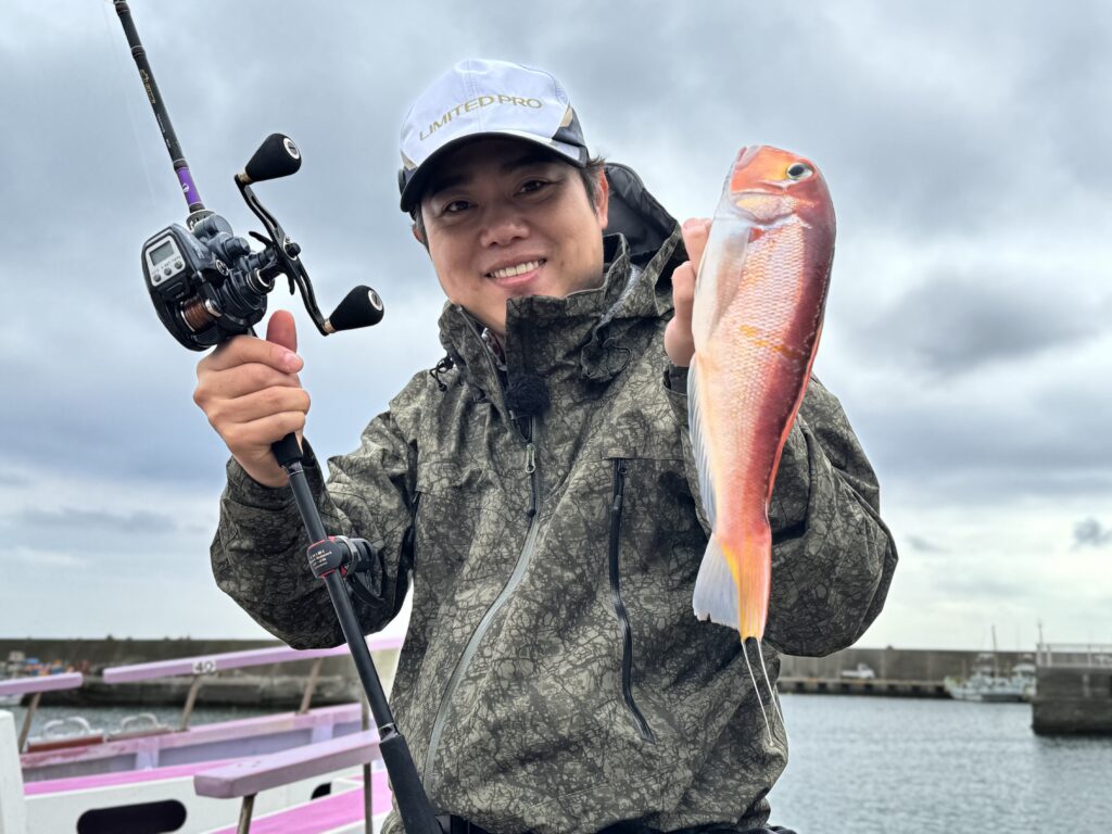 こうなると今度は自分も釣らなくてはいけない状況ですが…アタリ無く、遠くにキャストしてリフト巻き&フォールで底からベイト反応のある8m前後を狙いますが、ようやく出たアタリは小さなハナダイ…そしてまたハナダイと真鯛にアジャストできません。それでも船長が魚の反応を探しつつ移動を繰り返し次々にポイント変えていきます。そしてまた今度は4m上からフォールして底に着いた一瞬の違和感…合わせると小さな感触でしたが、上げてくると途中から急に引き始めて鯛の引きになりました。ドラグ設定は根に向かわせないために通常の約2倍の1.5㎏設定(MAX3.5㎏)で、ほぼドラグを使わずにkaijin瀬戸内テンヤゲームS240H+(https://www.alphatackle.com/product/kaijin-setouchi-tenya-game/)のロッドワークのみで真鯛を浮かせます。あがってきたのは1.6㎏の中鯛でした。
