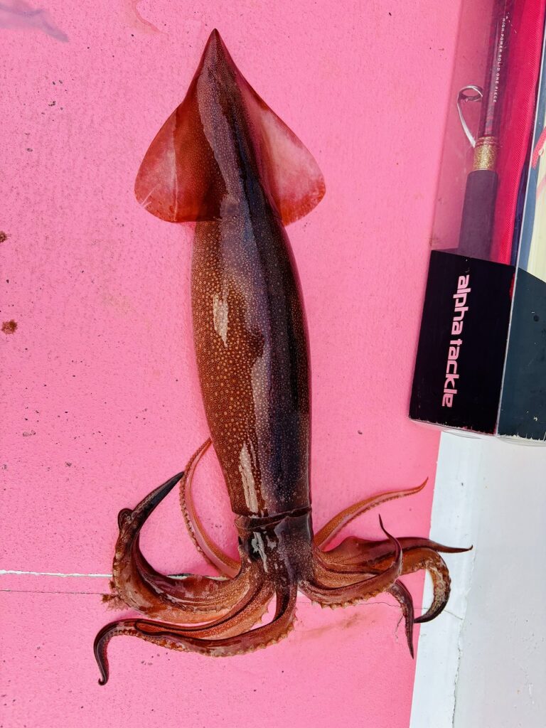 良型のスルメイカが船縁から見え、慎重かつ的確に取り込もうと、焦らずテンションを緩まぬようにし、本命スルメイカが取り込まれました!