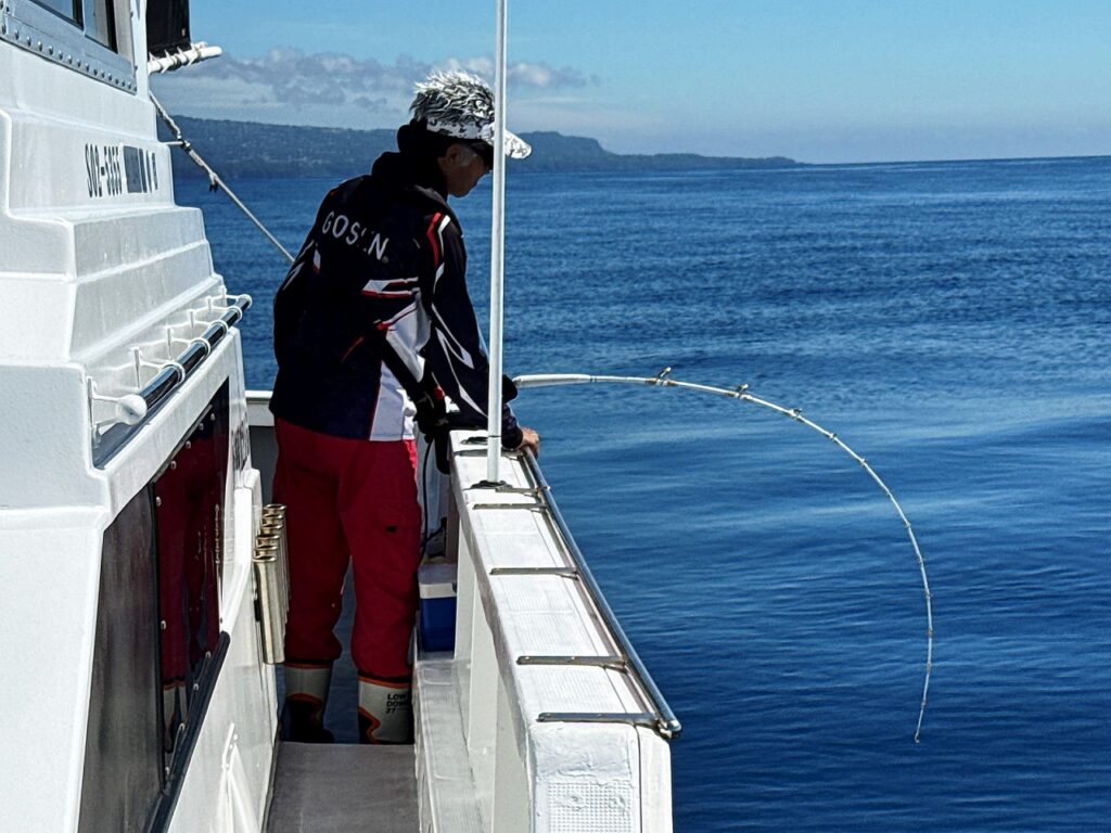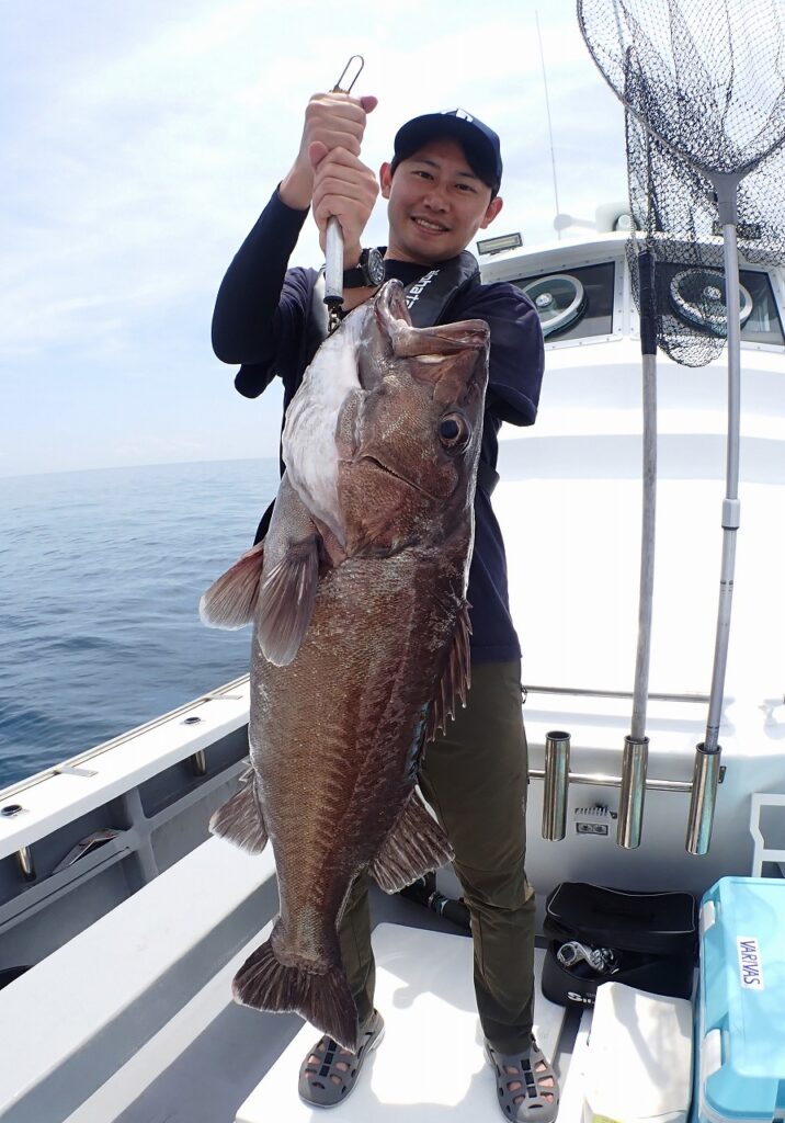 一旦静寂が戻った11時45分、アルファタックル下地スタッフに強烈なアタリ。周囲は大型ツノザメだろうと静観も、ラスト10mでいきなりラインが艫側に走り「ボコーン!!」海面に弾けたのは正真正銘、紛う事なきビッグなアラで船内大興奮。一手ずつ噛み締める様に手繰り寄せたのは9,5kgのビッグワン。人生初アラが最大級と「持っている」下地スタッフにcongratulations!!