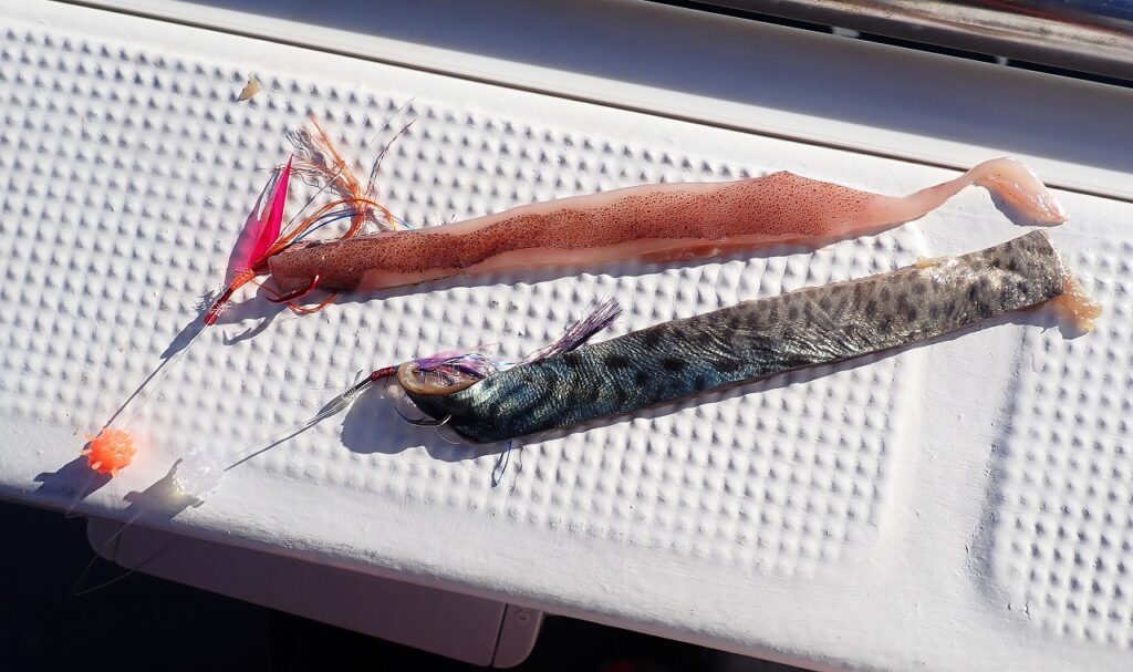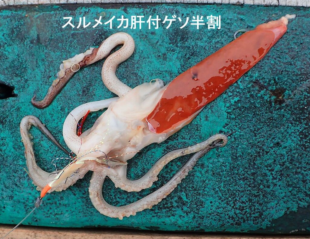 この日筆者が用意したエサはサバ短冊(幅1cm・長さ16~18cm)とサンマ半身斜め半割の魚2種とスルメスリット入り短冊(幅1cm・長さ16~18cm)、スルメ肝付ゲソ半割、デッドの小型ヤリイカ(全長15~16cm)のイカ3種で計5種類。(スルメ短冊はヤリイカ短冊に置き換えも良い)