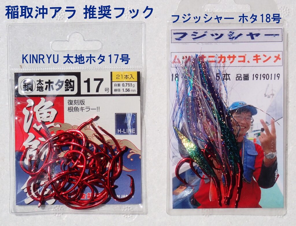 筆者愛用のフック。フジッシャー毛鈎をメインにサメが極端に多い際は空鈎の「鋼ホタ17号」をセレクト