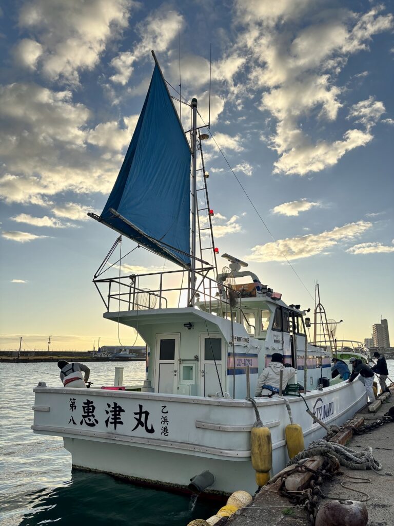 小春日和の夕刻、釣友と港へ到着。恵津丸の女将さんが軽トラを港へ付けて、順番に乗船名簿を記入。代金を支払うと釣座を指定されるので、荷物を船へ運ぶ。当日は中乗りさんが乗船していたので、座席まで荷物の運搬を手伝っていただいた。