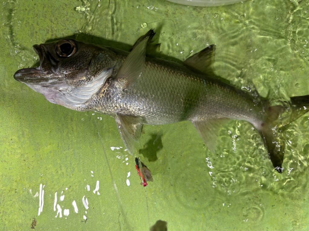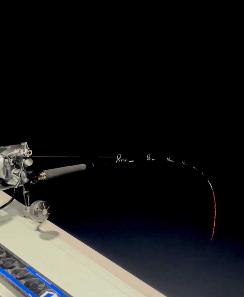 明るいうちはクロムツメインで、ボトム付近を探るが、日が暮れて暗くなりミヨシの方が本命を釣り上げた。やる気スイッチオン!船長からはボトム指示だが、上棚迄探って見ることにした。底取りから1メートル、2メートル、3メートルと待ちを入れながら探ると、3メートルでガグガクと竿先から魚信。