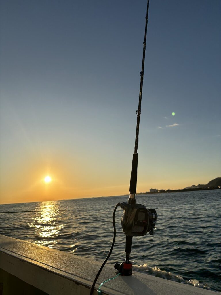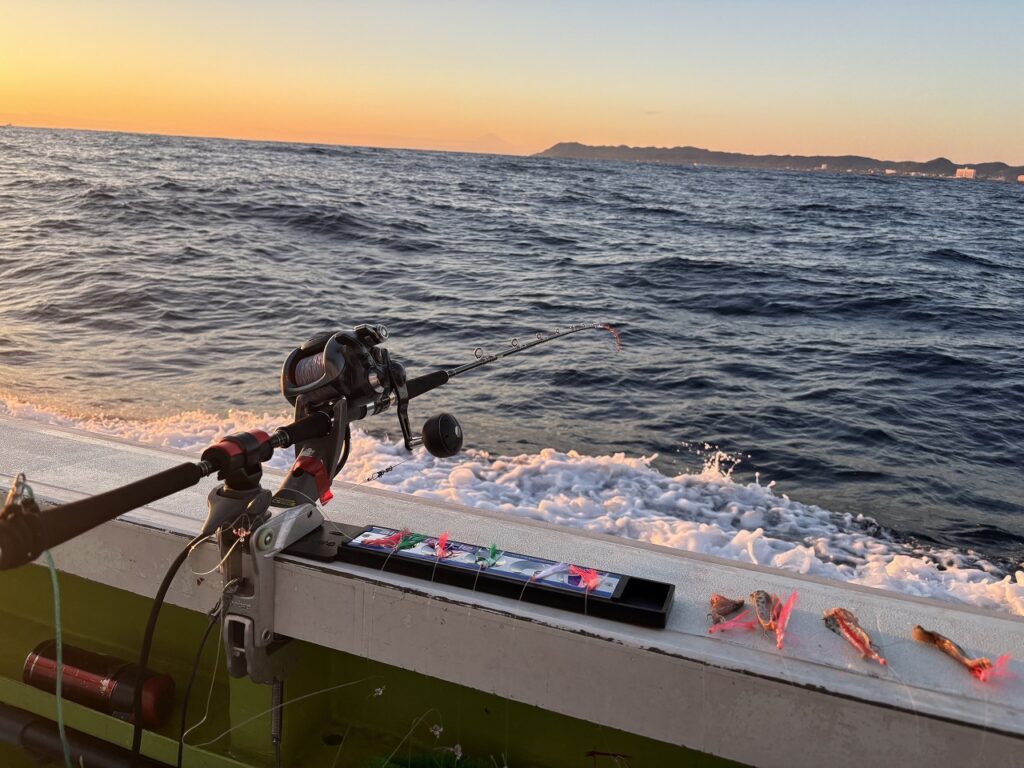 16時過ぎに出船。ポイント迄夕日の綺麗な海を眺めて進む。日があるうちは、クロムツメインで狙う模様。フラッシャーサビキの仕掛けの下4本にサバエサをセット。ポイントへ到着したが、船長は反応が全く出てないとの事。