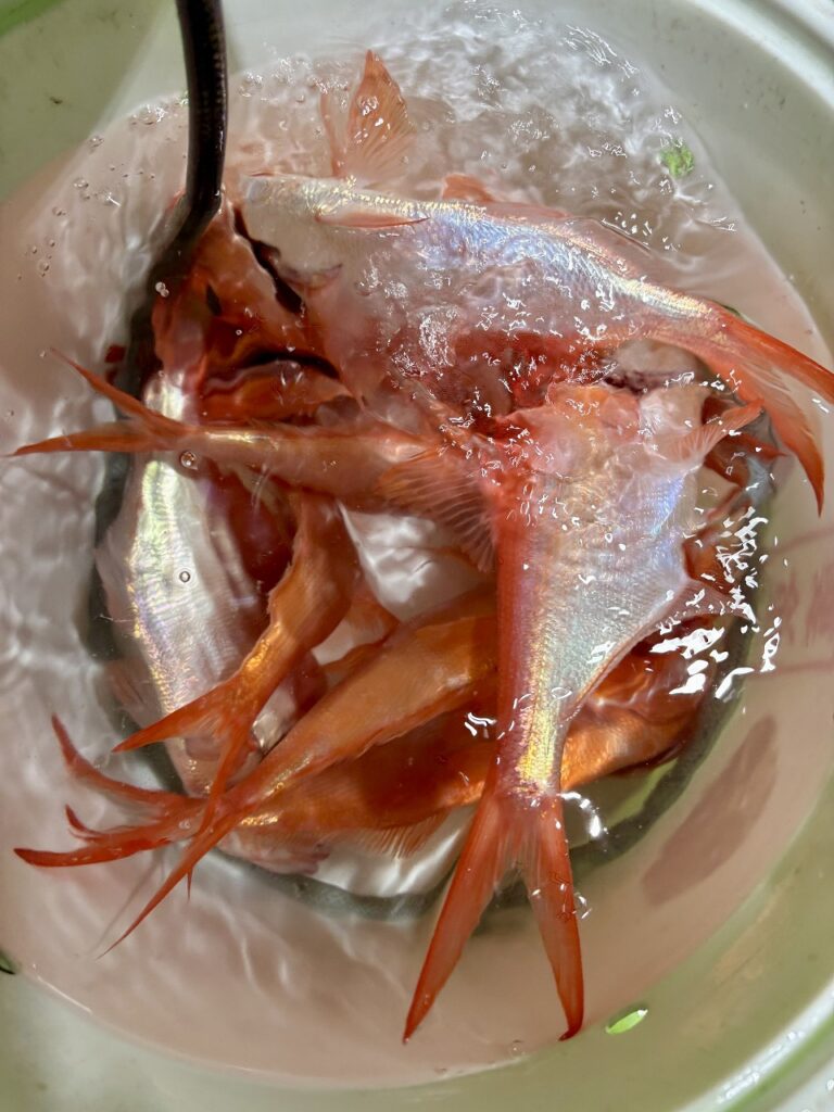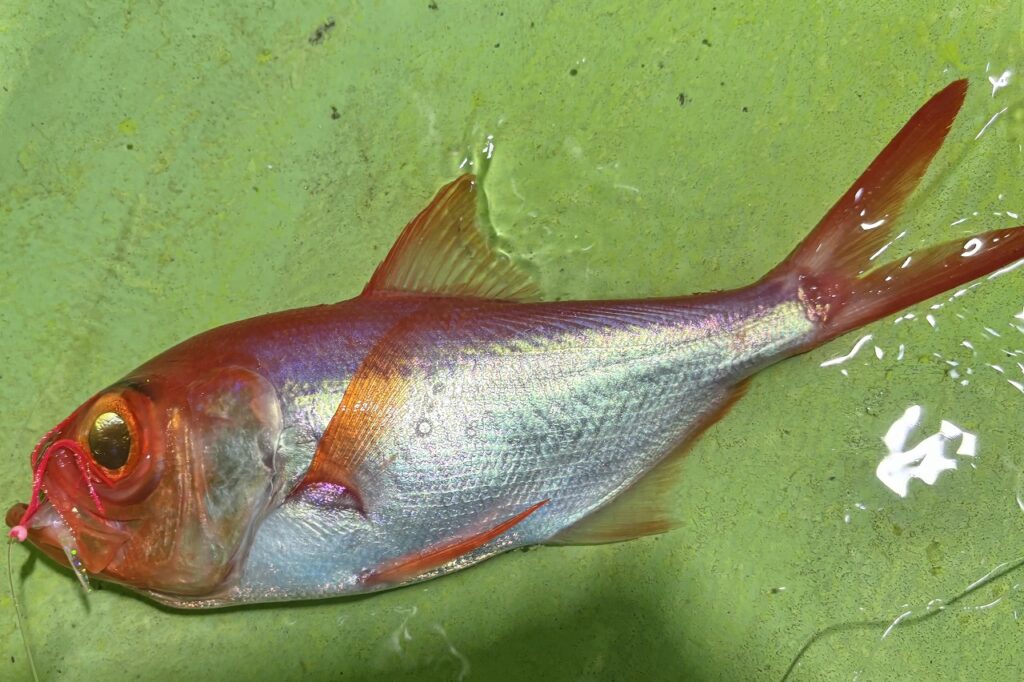 先程の投入で反応のあった上棚3〜4mを探ると、今度は4メートルで反応有り。大事に巻き上げるとキンメとスミヤキのダブル。スミヤキが活発で、本命との釣り分けも出来ず難しい状況。