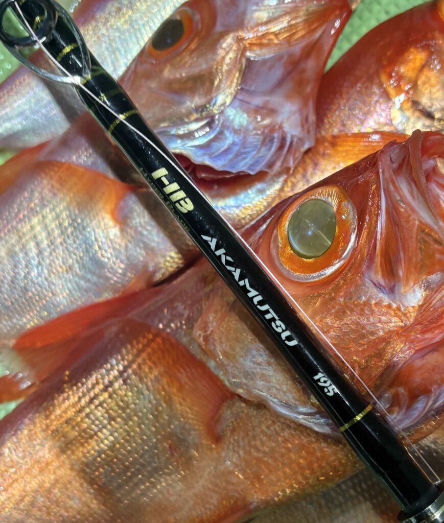 サバも見えるため、追い食いは期待せずに一尾づつ丁寧に取り込みをするようにと船長からのアナウンス。HB AKAMUTSU 195から魚の確信を伝えられ、柔らかく竿が曲がり、時折見せる引きを見てはワクワクが止まらない。