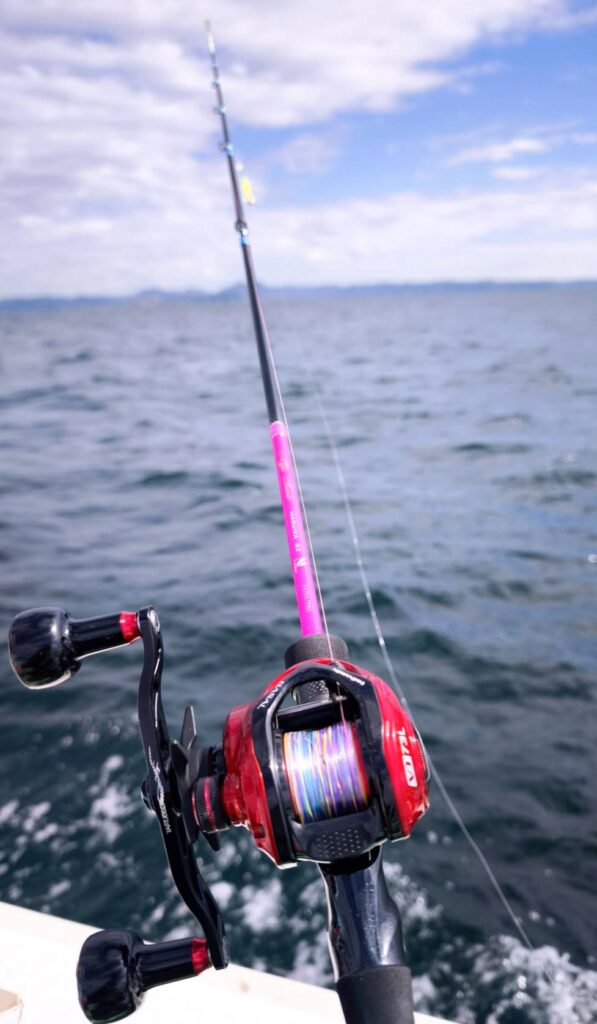 その後も100mレンジまで探ってくれてポツポツは拾えるけれど中小サイズばかりの単発で数は伸ばせずな昼近くなったタイミングで剣崎沖へ移動するとコチラはいい潮色でブッコミからブワッブワと大中サイズのヤル気な気配となったので、『なおちん』こと井上直美さん監修な渾身の新作ロッド『N-LIMITED』に持ち替えてみると宙釣り用の作りだけどゼロテンでもバッチリやれて、短さ&軽さ&操作性の良さ&チタントップの目感の出方と、どれを取っても名竿の予感なフィーリングです!!