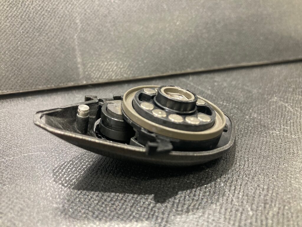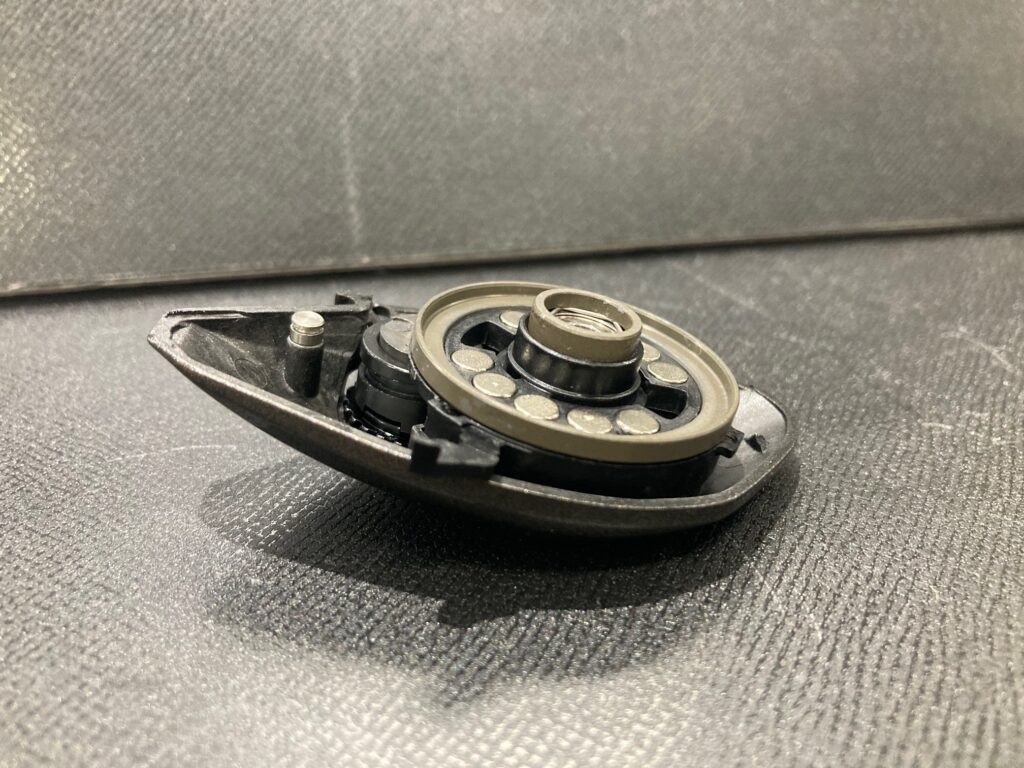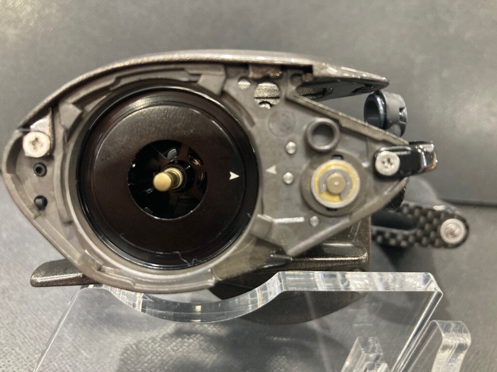 あ、取扱説明書的なことをもう一つ。スプールと、ボディにそれぞれ小さな白い矢印マークがあります。スプールを外す・入れるときは、この矢印を合わせて脱着してください。この矢印が合ってないと外れない・入らないのですが、これはなぜかというとスプール落下防止のためです。カバーを外したときにスプールが突然ポロリと落ちてしまわないように、スプール落下防止システムを取り入れています。