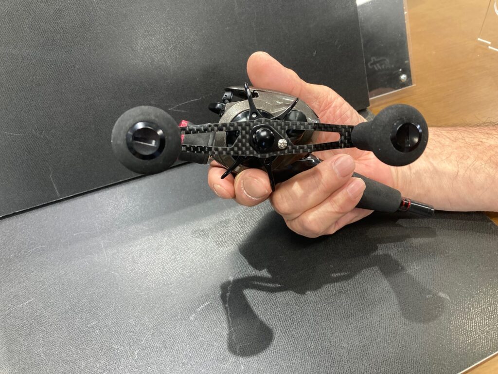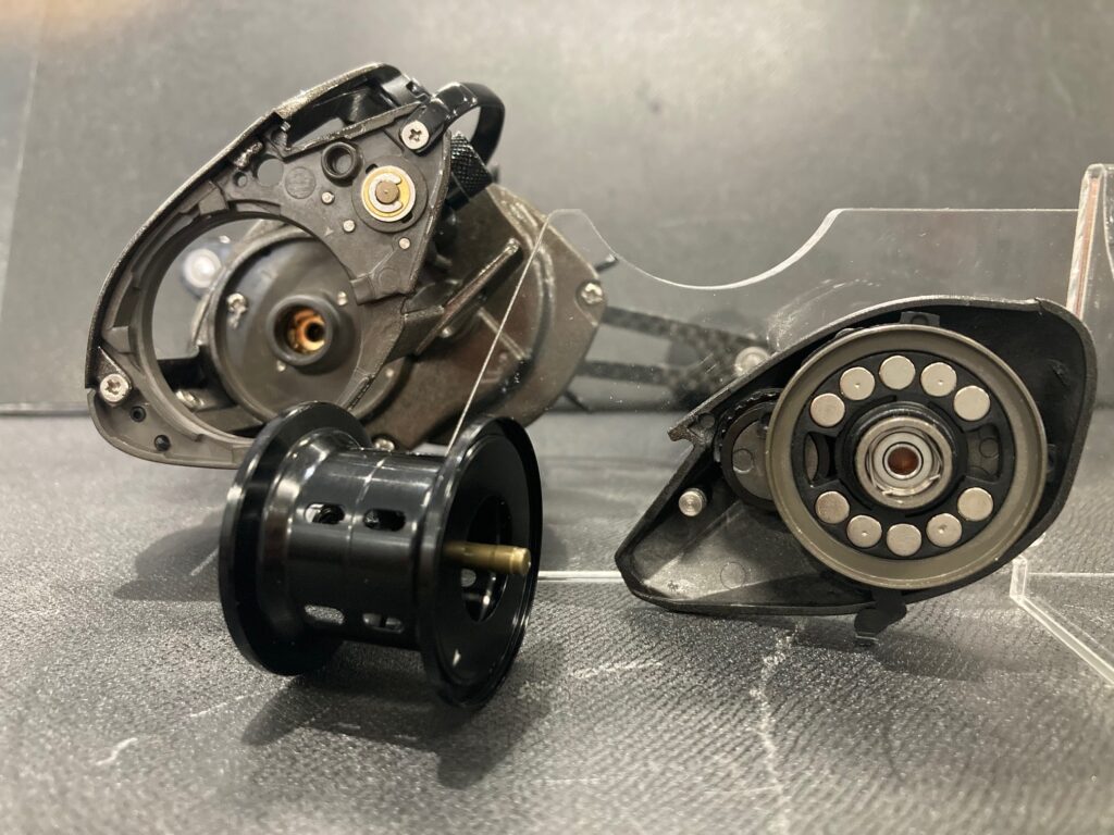 センターフレームとギアサイドカバーはアルミ製。樹脂ボディと比較すると、非常に高い剛性で安定感抜群。水深が深いところから巻き上げてくるときにボディがカッチリしていることを感じ、安心感があります。
